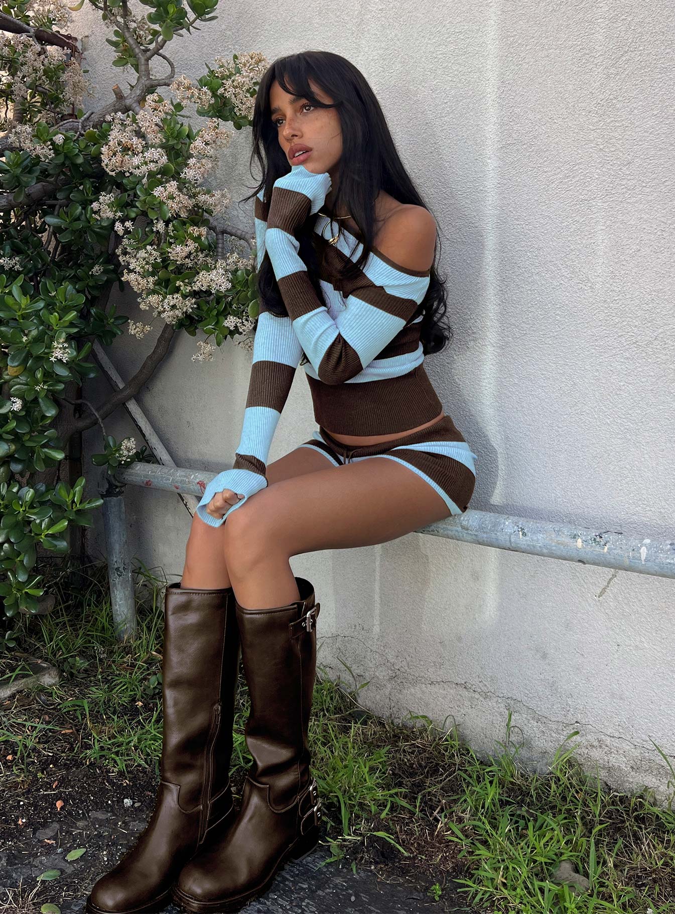 Ahani Off Shoulder Knit Top Blue / Brown
